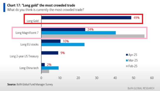4월초에 시행된 뱅크오브어메리카(BofA)에서 글로벌 펀드매니저들을 대상으로 가장 인기있는 트레이드 거래 대상에 대한 리서치 결과를 보시면, 4월들어 갑자기 금의 인기가 엄청 높아진 것을 보실 수 있습니다.